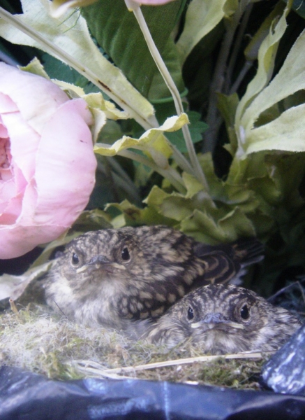 Spotted Flycatchers hatch in hanging basket at Acorn Court July 2010